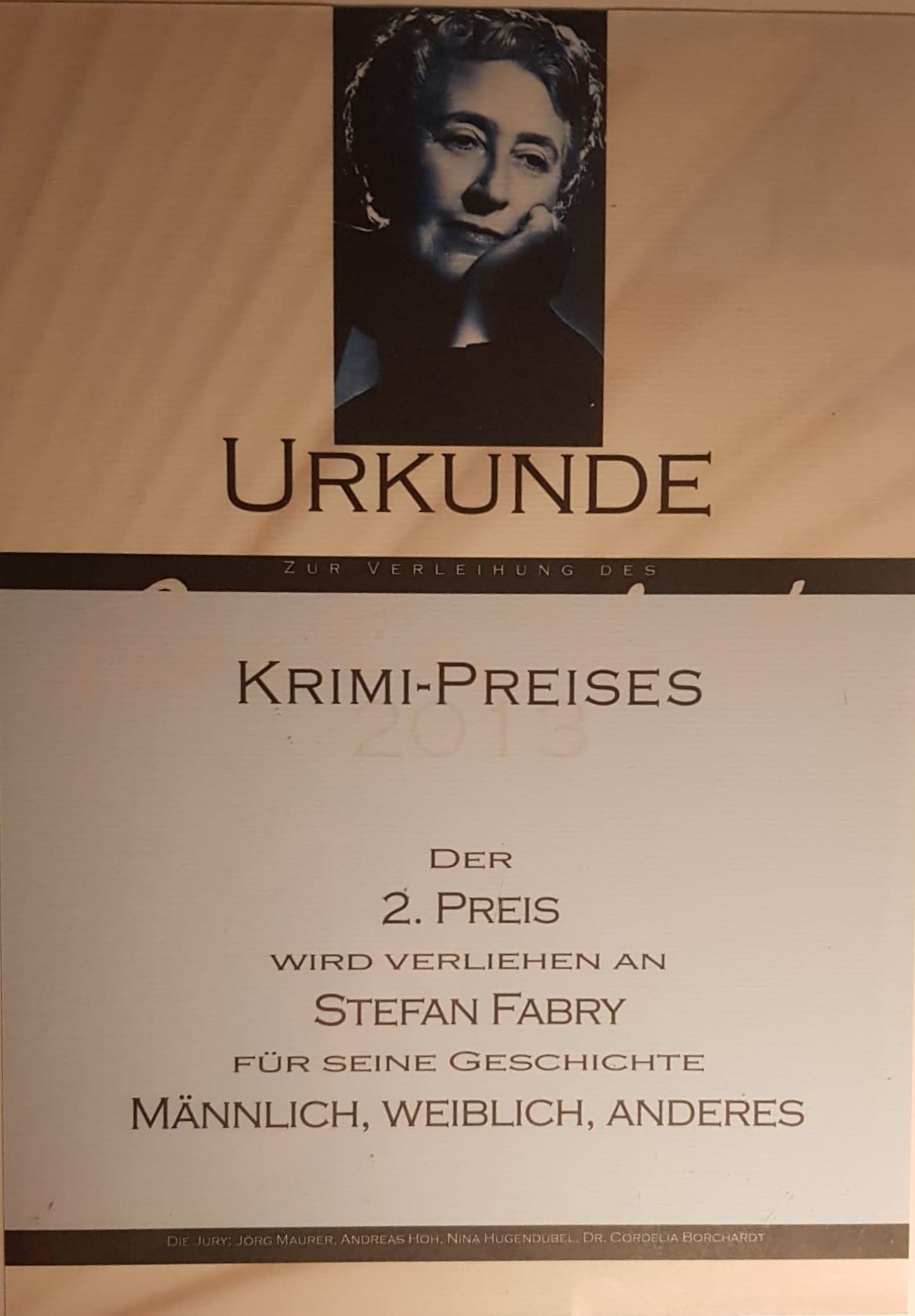 Denn die Anregung für das Hörspiel kam ursprünglich von Cynthia (@Deunan), die Ende 2022 neue Stücke für ihr Projekt „Seasons“ suchte. Ich hatte zufällig im Jahr 2012 im Rahmen eines Agatha-Christie-Krimi-Wettbewerbs (siehe: WIKI: Agatha-Christie-Krimipreis) zum Thema "Eine Frage des Alibis" eine 10-seitige Kurzgeschichte mit dem obigen Titel „Männlich, weiblich, anderes“ eingereicht, die den 2. Preis gewann und vom Fischer-Verlag in der Sammel-Anthologie „Eine Frage des Alibis“ (ISBN 978-3-596-19706-4) zusammen mit den 24 anderen bestbewerteten Storys des Preisausschreibens 2013 veröffentlicht wurde (wobei alle Rechte bei den Autoren verblieben).