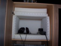 Auf den Boden haben wir eine Trittschalldämmung gelegt, darauf eine OSB-Platte, nochmal Trittschalldämmung und noch eine OSB-Platte. Mit Metallwinkeln wurden an den Ecken Pfosten aus Vierkanthölzern angeschraubt, wobei unter die Winkel so ein dickes Schaumstoffklebeband geklebt wurde. Die Wände bestehen aus OSB-Platten (innen), dann einer dicken Schicht Rockwool und Rigipsplatten (außen). Die Tür besteht aus zwei OSB-Platten (innen und außen) und ebenfalls Rockwool. Das Fenster ist aus Acrylglas. Ist natürlich eine Schallbrücke, ich bin aber trotzdem froh, dass es da ist, weil man sich sonst drinnen sehr beengt fühlt. Auf dem Boden und an der Tür klebt Teppich (oder haben wir den getackert? Ich weiß es nicht mehr...) An den Wänden ist erst ein glatter Schaumstoff und darauf Noppenschaum. Den haben wir auf jeden Fall getackert, weil die diversen Sprühkleber, die wir ausprobiet haben, nicht gehalten haben. Für die Kabel haben wir einen Kabelkanal durch die Wand gelegt, bestehend aus einem Heulrohr. Das sind diese gerippten Plastikrohre, die wir als Kinder über dem Kopf geschwungen haben und die dann ganz herrlich geheult haben. Wisst ihr, was ich meine? So ein Ding haben wir irgendwie in einem Bogen in die Wand gelegt, so dass die Kabel außen ziemlich weit unten herauskommen und drinnen relativ weit oben hineingehen. Die Decke besteht aus einer OSB-Platte (außen) und einer Schicht Rockwool, die von innen nur mit weißem Molton abgehängt ist. So, ich hoffe, ich konnte alles einigermaßen verständlich machen. Ansonsten fragt einfach! Entweder mich oder meinen Liebsten, der hier als Persifedron unterwegs ist und die Kabine mit großer Hingabe gebaut hat. Und ich finde, sie ist ihm großartig gelungen!