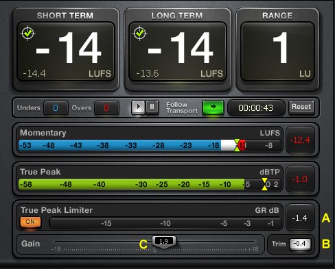 Im Gegensatz zu den typischen Onboard und dB Limitern einer DAW, arbeiten diese Tools mit integrierten TruePeak-Limitern, die hinsichtlich LUFS-Ausgabewert auch gleichzeitig in Echtzeit den Wert auf den integrierten Limiter übertragen bekommen (unten in der Grafik unter "B"), welcher dann entsprechend eingreifend trimmen kann.